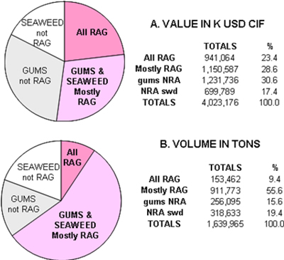 Global seaweed and gum imports for the countries and categories covered in the present study for the period 2002-2006. RAGS products accounted for about 52 % of total value and 65% of total volume.